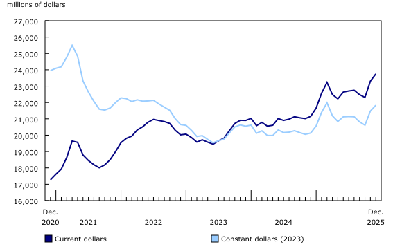 On a constant dollar basis (2023=100), the total value of investment in building construction in December rose 1.7% from the previous month to $21.8 billion and was up 8.4% year over year.