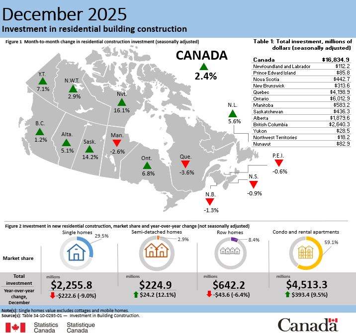 Investment in residential building construction rose $1.1 billion to $48.8 billion in the fourth quarter. This increase was primarily attributed to the multi-unit component (+$895.9 million), followed by the single-family component (+$243.2 million). Additionally, the increase in investment was broad-based with seven provinces and two territories reporting gains.