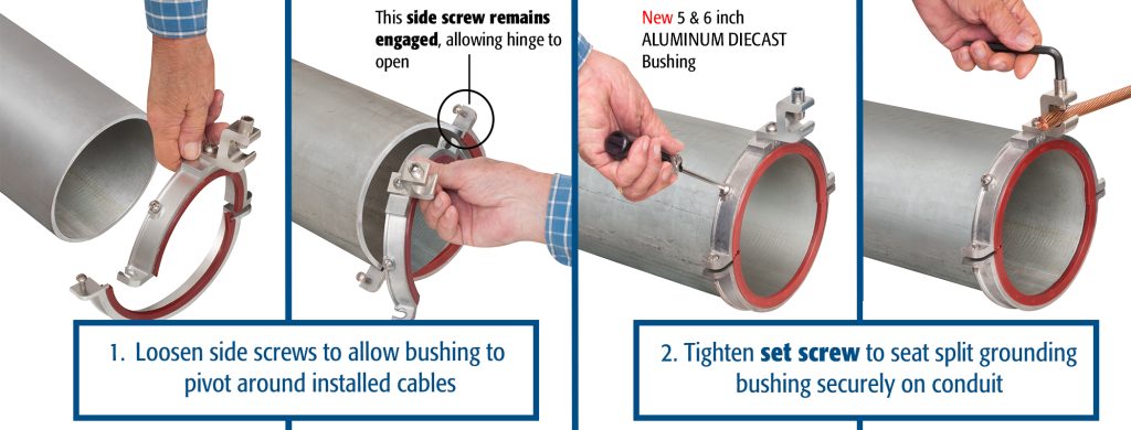Arlington’s 550 series zinc diecast – and new 5 and 6 inch aluminum diecast split grounding bushings deliver convenience and time-savings.