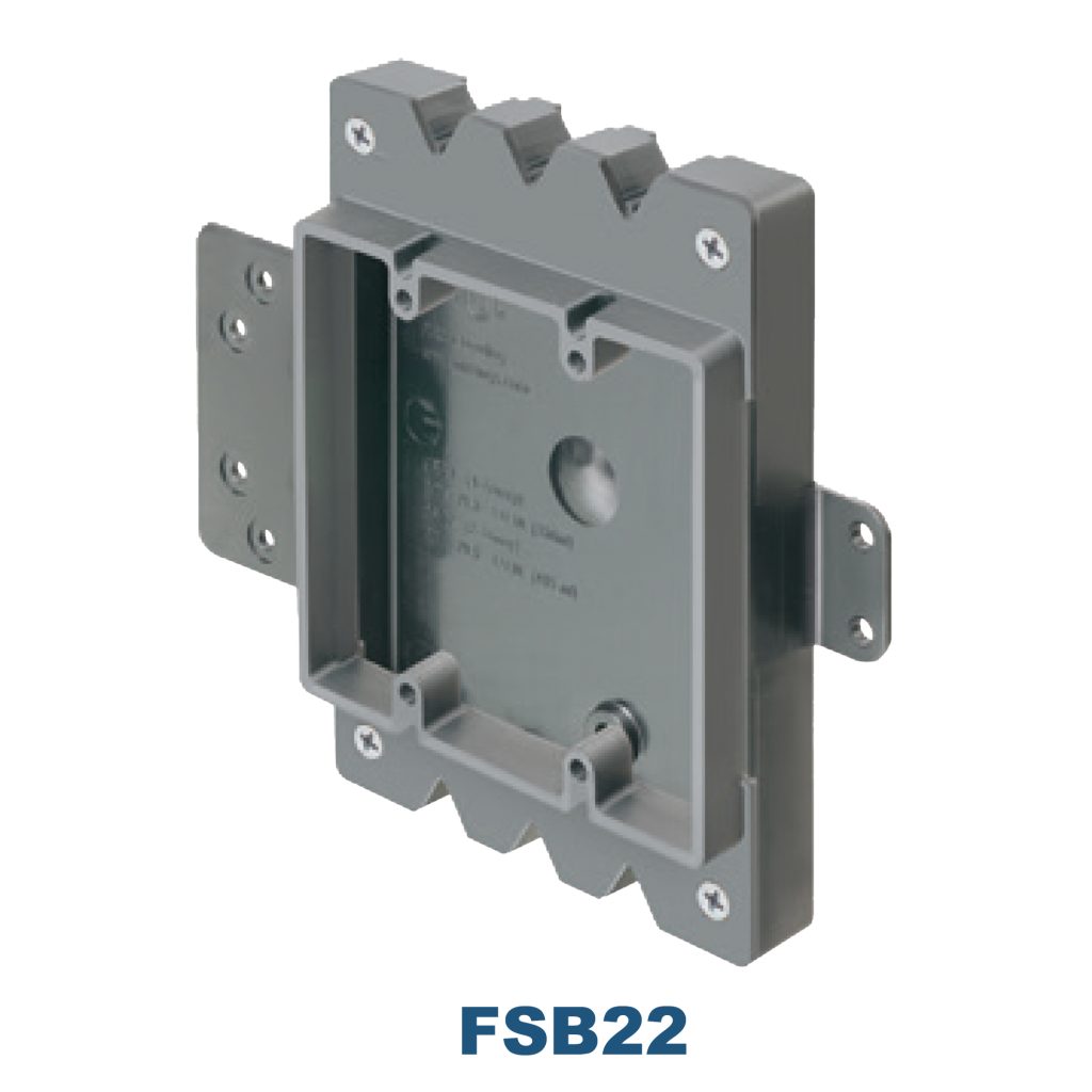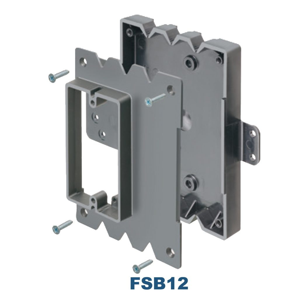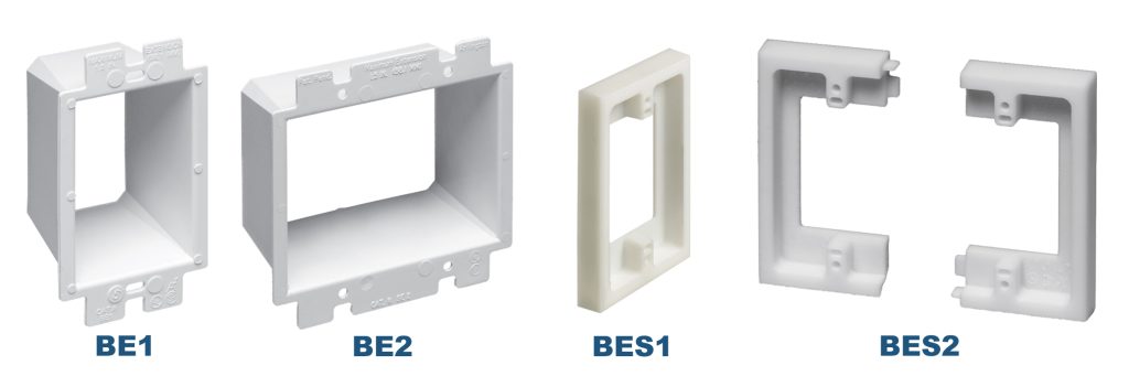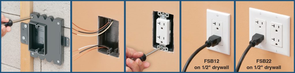 Flexible Furred Wall Box installs on 1×2 drywall furring strips or block wall – with 1/2” drywall, allowing installers to place a standard or GFCI device (in varying depths) where needed. Uses standard decorator-style wall plates.