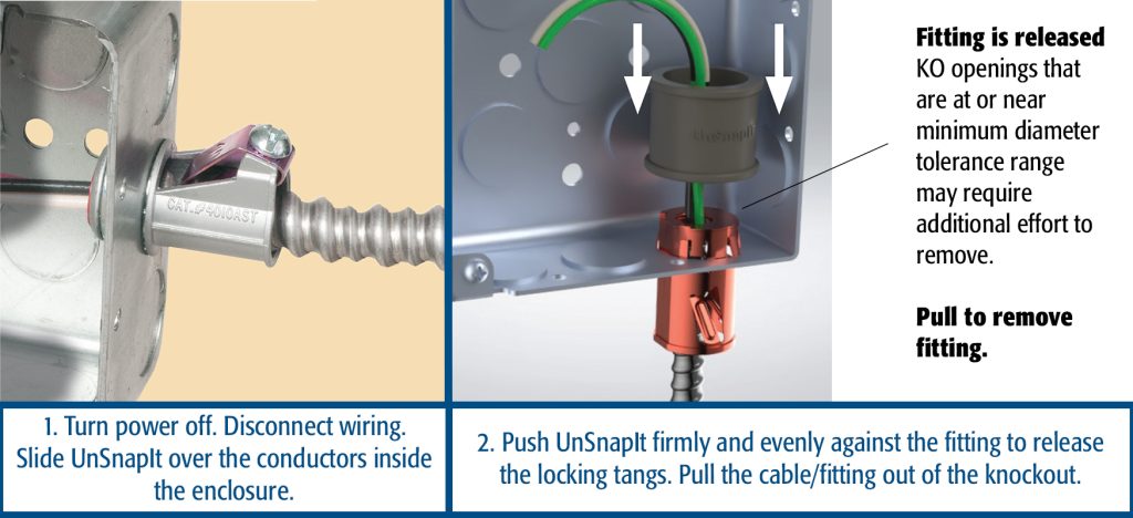 UnSnapIt works on Arlington’s 1/2″ trade size SNAP-TITE® and Snap2It® connectors – as well as other manufacturers’ snap-in connectors.
