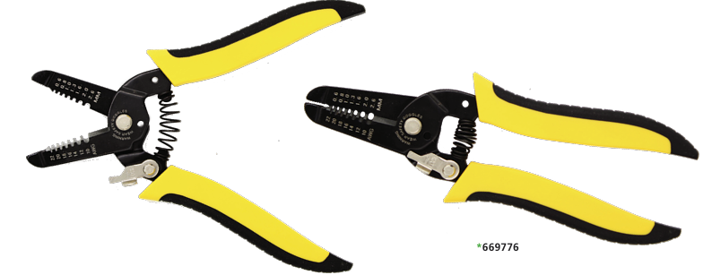 4-In-1 Wiring Tool (669776) with rubber insulated handles for a more comfortable grip. In addition to the side cutters found on one edge, this multi-functional wiring tool can be used for crimping, cutting and stripping 22-10GA Wire. Its compact size allows for use in cramped areas. Approximate length: 7″ (177.80mm)